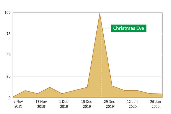The map below shows which festive dishes had the highest percentage increase in search interest across each region over the last Christmas period. Ham has the biggest spread with 8 out of 17 regions showing the biggest spike in searches during Christmas 2019.