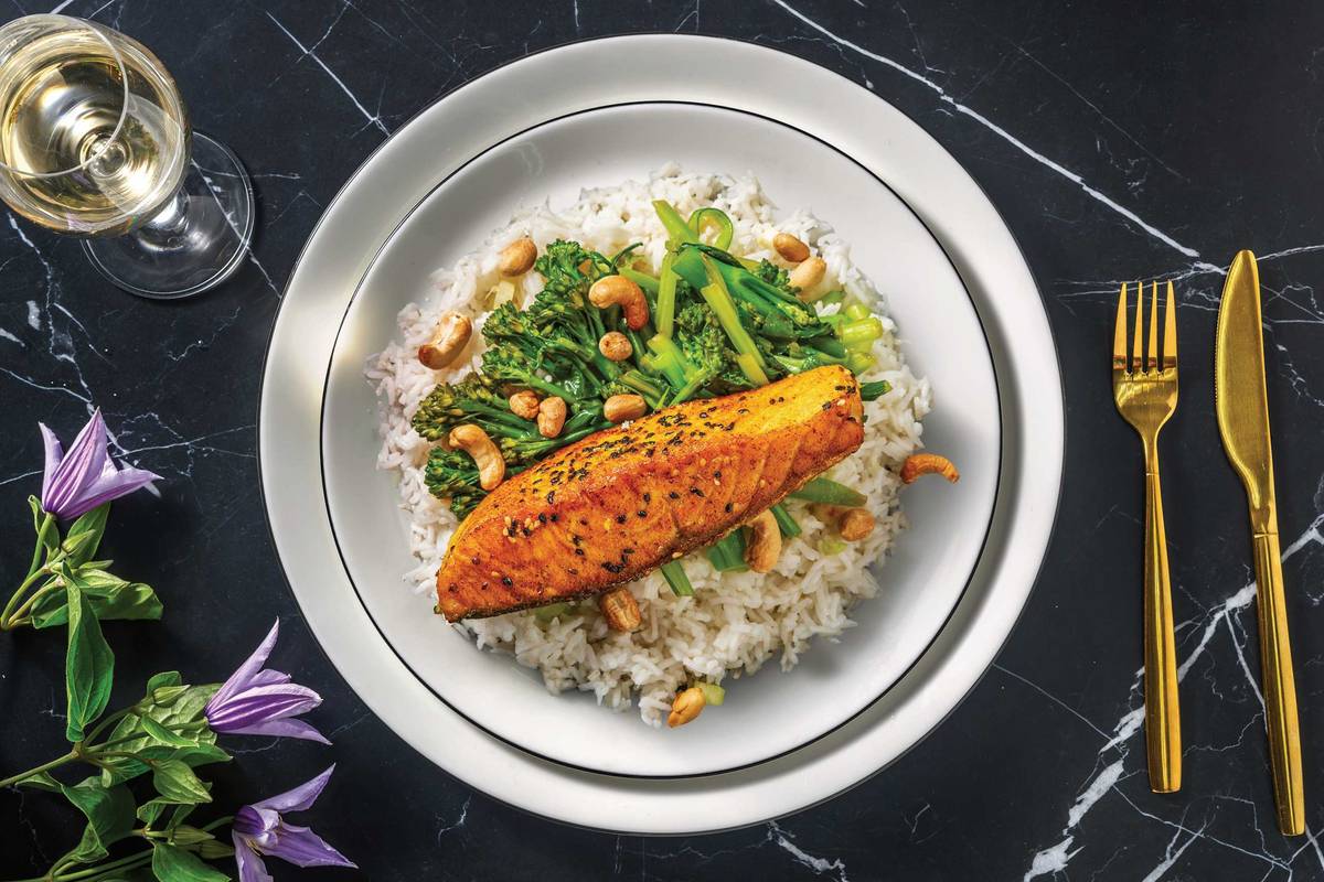• While the veggies are cooking, combine mild laksa seasoning, mixed sesame seeds and the salt in a shallow bowl. • Pat Akaroa salmon dry with paper towel, then drizzle with olive oil and season with salt and pepper. Press salmon into sesame mixture and turn to coat on both sides. TIP: Patting the skin dry helps it crisp up in the pan!