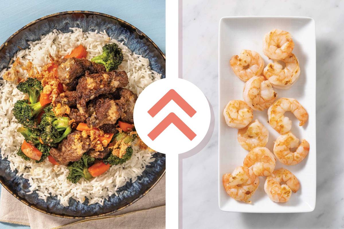 • In a large frying pan, heat a drizzle of olive oil over high heat. Cook broccoli, and carrot for 2 minutes. • Add the soy sauce and honey and cook, tossing, until veggies are tender, 4-5 minutes. Transfer to a bowl and cover to keep warm. • Discard any liquid from beef strips packaging. • In a medium bowl, combine beef strips, sweet soy seasoning and a drizzle of olive oil. • Wipe out the frying pan, then return to high heat with a drizzle of olive oil. When oil is hot, add beef strips and cook, tossing, until browned and cooked through, 1-2 minutes. ~~~~~~~~~~ MODULAR STEP ~~~~~~~~~~ Custom Recipe: If you've upgraded to peeled prawns, season prawns in the same way as the beef. Reheat the pan as above. When oil is hot, cook prawns, tossing, until pink and starting to curl up, 3-4 minutes.