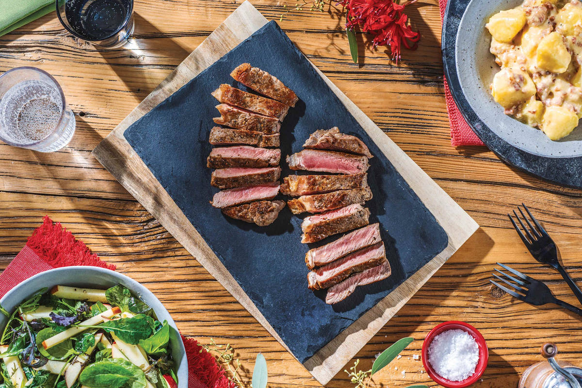 Slice the steak. Bring everything to the table to serve. Help yourself to the steak, cheesy bacon potatoes and apple salad. Enjoy!
