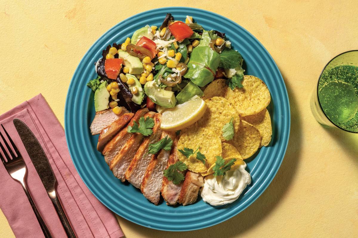 • In a bowl, combine salad leaves, avocado, corn, tomato, cheese, jalapeños (if using), a squeeze of lemon juice and a drizzle of oil. Season • Slice the pork. Plate up BBQ-glazed pork, avocado salad and corn chips • Tear over coriander. Serve with sour cream and any remaining lemon cut into wedges