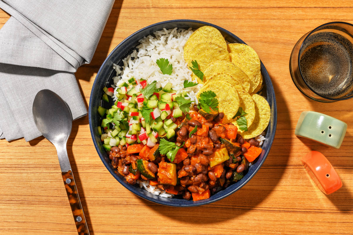 Get a load of this gently spiced black bean chilli that knows no bounds when it comes to flavour. Sitting on a bed of garlic-infused rice and served with crunchy corn chips, this is a recipe for a hearty bowl you won’t soon forget.
