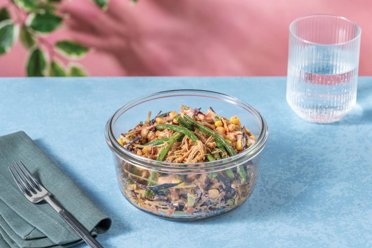 • While the baby broccoli and pork are cooking, roughly chop coriander. Drain the sweetcorn. • In a large bowl, combine coriander, slaw mix and sweetcorn.