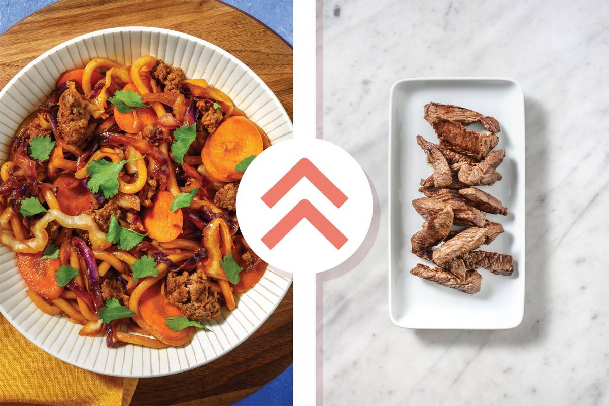 • In a large frying pan, heat a drizzle of olive oil over high heat. Discard any liquid from beef strips packaging. • When oil is hot, cook beef strips in batches, tossing, until beef is browned and cooked through, 1-2 minutes. Return all beef to the pan. • Add sweet soy seasoning, shredded cabbage mix, carrot, garlic and ginger paste and cook until fragrant, 3-4 minutes. • Add cooked udon noodles and char siu sauce mixture and cook, tossing, until thickened, 1-2 minutes.