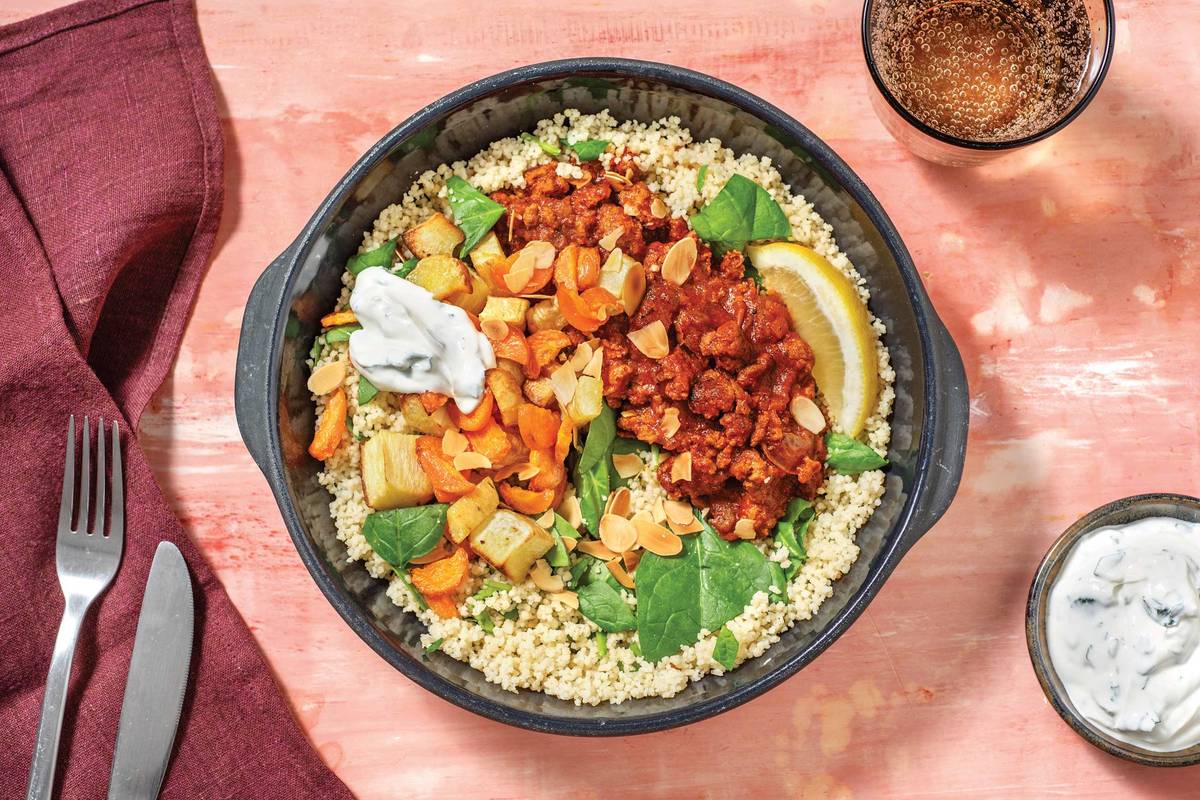 • While the couscous is cooking, return the frying pan to medium-high heat with a drizzle of olive oil. Cook onion, stirring, until softened, 5-6 minutes. • Add lamb mince and bacon and cook, breaking it up with a spoon, until golden, 4-5 minutes. • Add garlic, tomato paste, chermoula spice blend and currants and cook, stirring, until fragrant, 1-2 minutes.