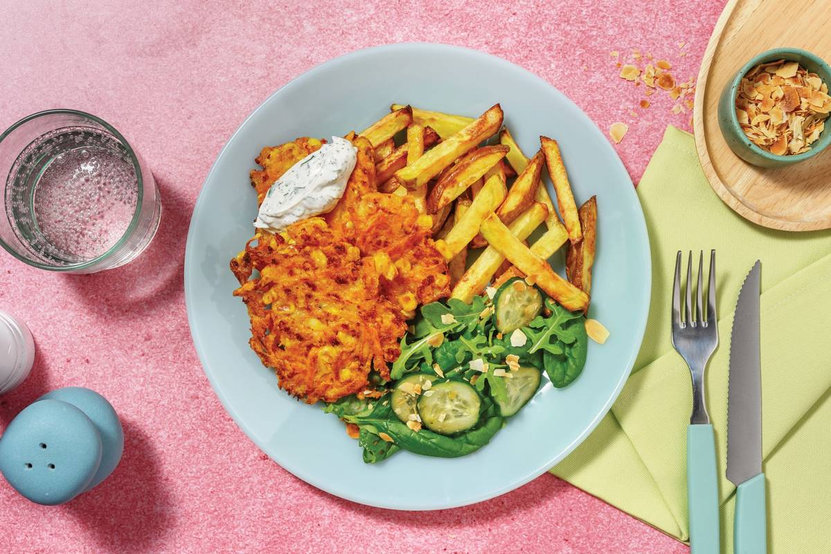 • Divide cheesy corn fritters, potato fries and cucumber salad between plates. • Garnish with toasted almonds. Serve with dill & parsley mayonnaise to serve. Enjoy!