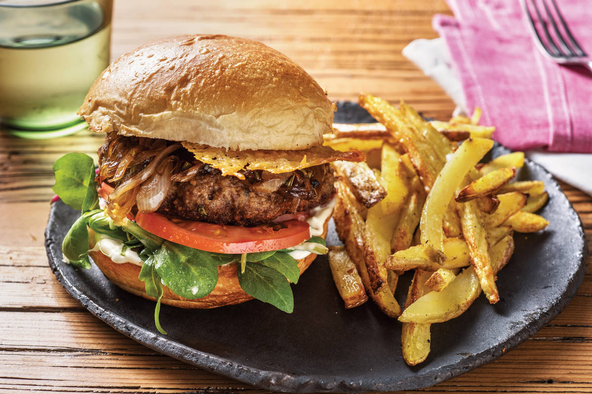 They say that great seasoning will take your food to places you can only dream of. So, we're boosting the flavour of these cheesy beef patties with our special Aussie spice blend. Sticky caramelised onion and baked potato fries will have this dish competing for the title of 'Best Burger Ever'.