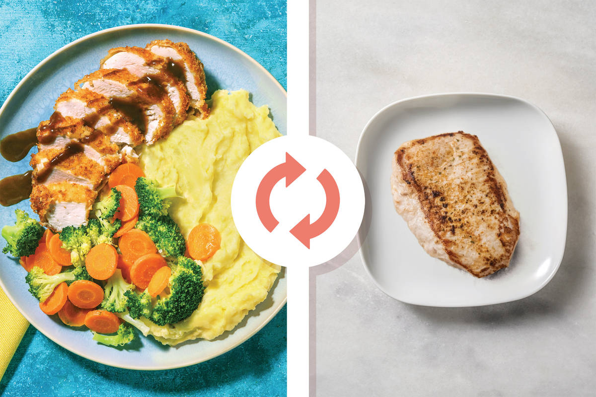 • While veggies are cooking, boil the kettle. • Dip pork schnitzels into the flour mixture, followed by the crumbing mix. Set aside on a plate. • Heat a large frying pan over medium-high heat with enough olive oil to coat the base. When oil is hot, cook pork schnitzels in batches until golden and cooked through, 1-2 minutes each side. Transfer to a paper towel-lined plate.
