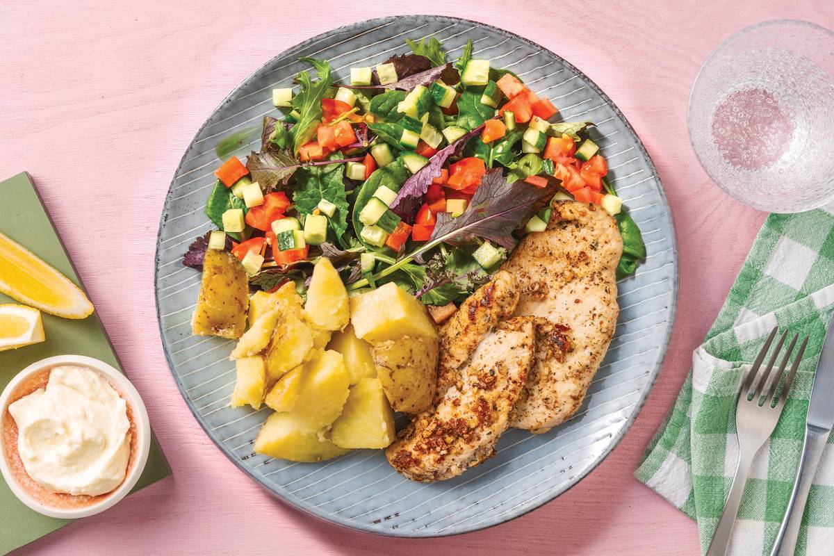• Meanwhile, combine radish, cucumber, mixed salad leaves and a squeeze of lemon juice and a drizzle of olive oil in a large bowl. Season to taste. • Divide cheesy-top chicken, creamy crushed potatoes and cucumber salad between plates. • Serve with any remaining lemon wedges. Enjoy!