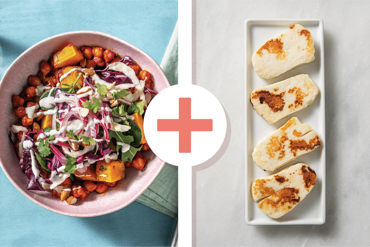 • Add chickpeas, the water, plant-based butter and a pinch of brown sugar and cook until slightly thickened, 3-4 minutes. • Drain haloumi and pat dry. Cut the haloumi into 1cm-thick slices. • In a large frying pan, heat a drizzle of olive oil over medium-high heat. • Cook haloumi until golden brown, 1-2 minutes each side (Cook in batches if your pan is getting crowded). Transfer to a paper towel-lined plate.
