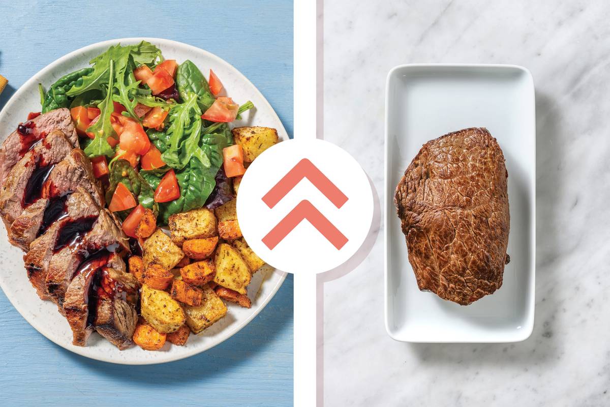 • Slice seared steak. • Divide spiced veggie chunks, tomato salad and steak between plates. • Spoon cherry glaze over steak to serve. Enjoy!
