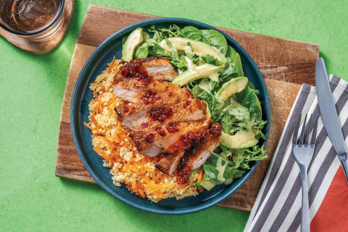 • Slice chilli jam-glazed pork. • Add carrot to couscous and stir to combine. Season to taste. • Divide carrot couscous and avocado salad between plates. • Top with pork. Spoon over any remaining glaze from the pan to serve. Enjoy!