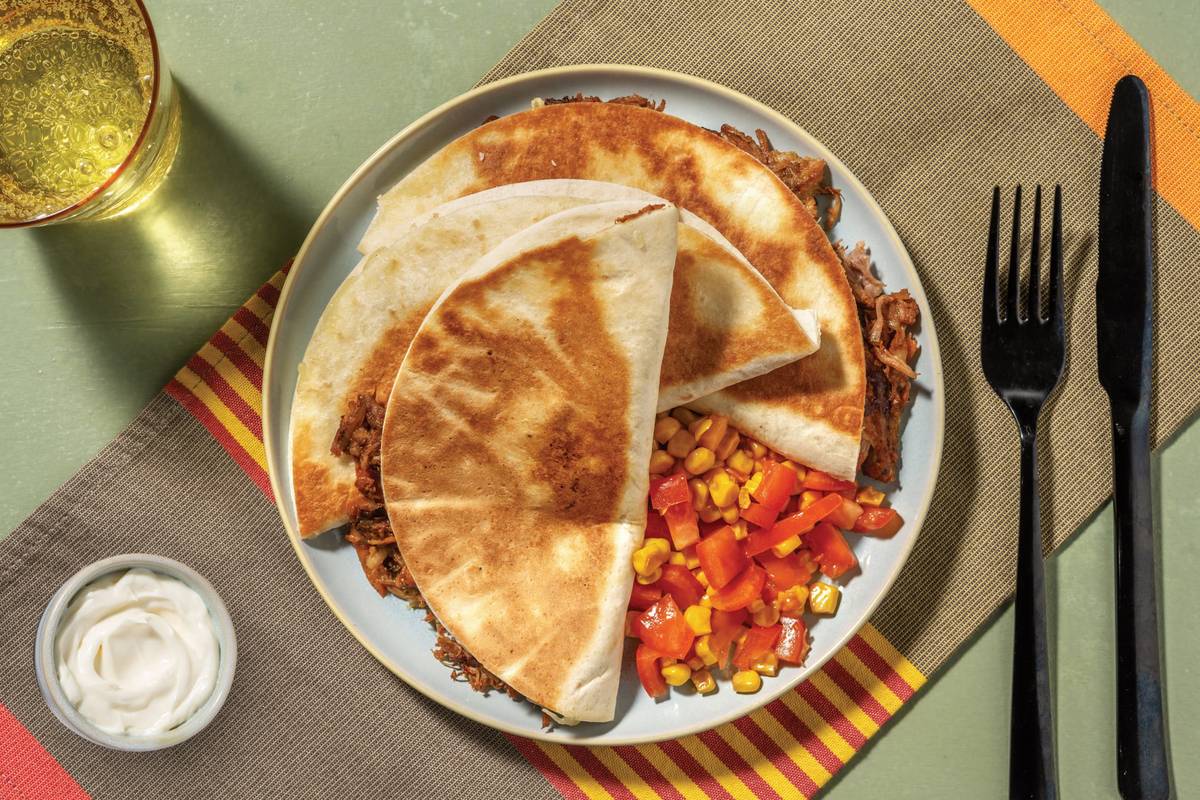 • Arrange mini flourtortillas on a lined oven tray. Divide pork filling between tortillas, spooning it onto one half of each tortilla, then top with shredded Cheddar cheese. • Fold the empty half of each tortilla over to enclose filling and press down with a spatula. Brush or spray tortillas with a drizzle of olive oil and season with salt and pepper. • Bake quesadillas until cheese has melted and tortillas are golden, 10-12 minutes. Spoon any overflowing filling back into quesadillas.