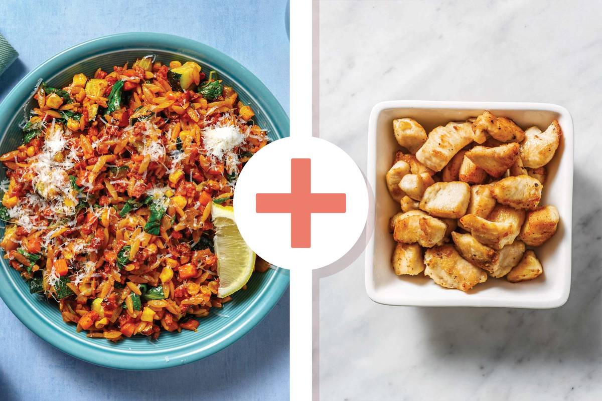 Custom Recipe: If you've added chicken breast, cut chicken breast into 2cm chunks. Heat the pan as above. Cook chicken with chorizo, garlic & herb seasoning and soffritto mix, tossing occasionally, until browned and cooked through, 5-6 minutes. Continue with step.