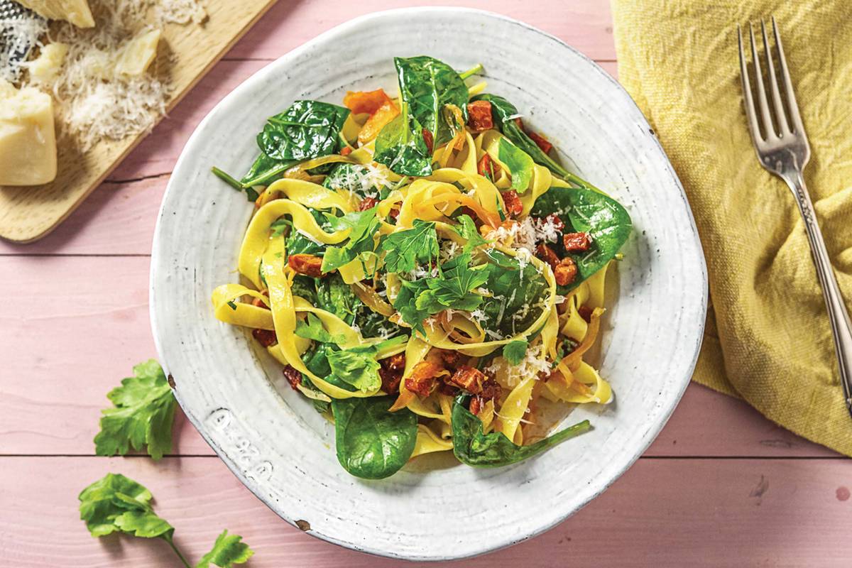 Add the fettuccine, parsley and butter to the pan with the chorizo. Toss to coat the fettucine and then remove the pan from the heat. Season to taste with a pinch of salt and pepper and squeeze over the juice from a lemon wedge. TIP: Add as much or as little lemon juice as you like depending on your taste preference. TIP: Lemon can help to season and bring out the flavour in food the same way that salt does!