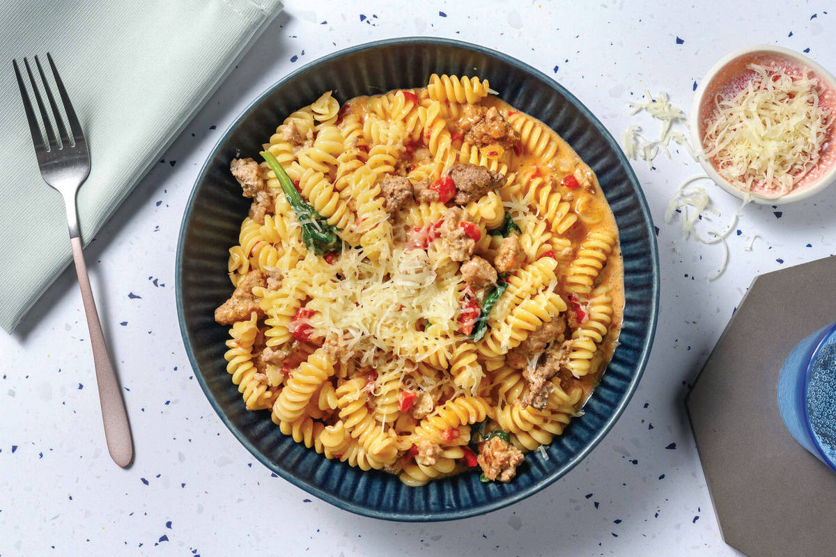 Both a beef and pork mince are cooked into a romesco creamy sauce dotted with pan-fried veggies for a rich and decadent pasta sauce. Sprinkle with some Parmesan cheese at serving to add bite and a hint of nostalgia, because what pasta would be complete without a little cheese. *We’ve replaced the fusilli in this recipe with penne due to local ingredient availability. It’ll be just as delicious, just follow your recipe card!*