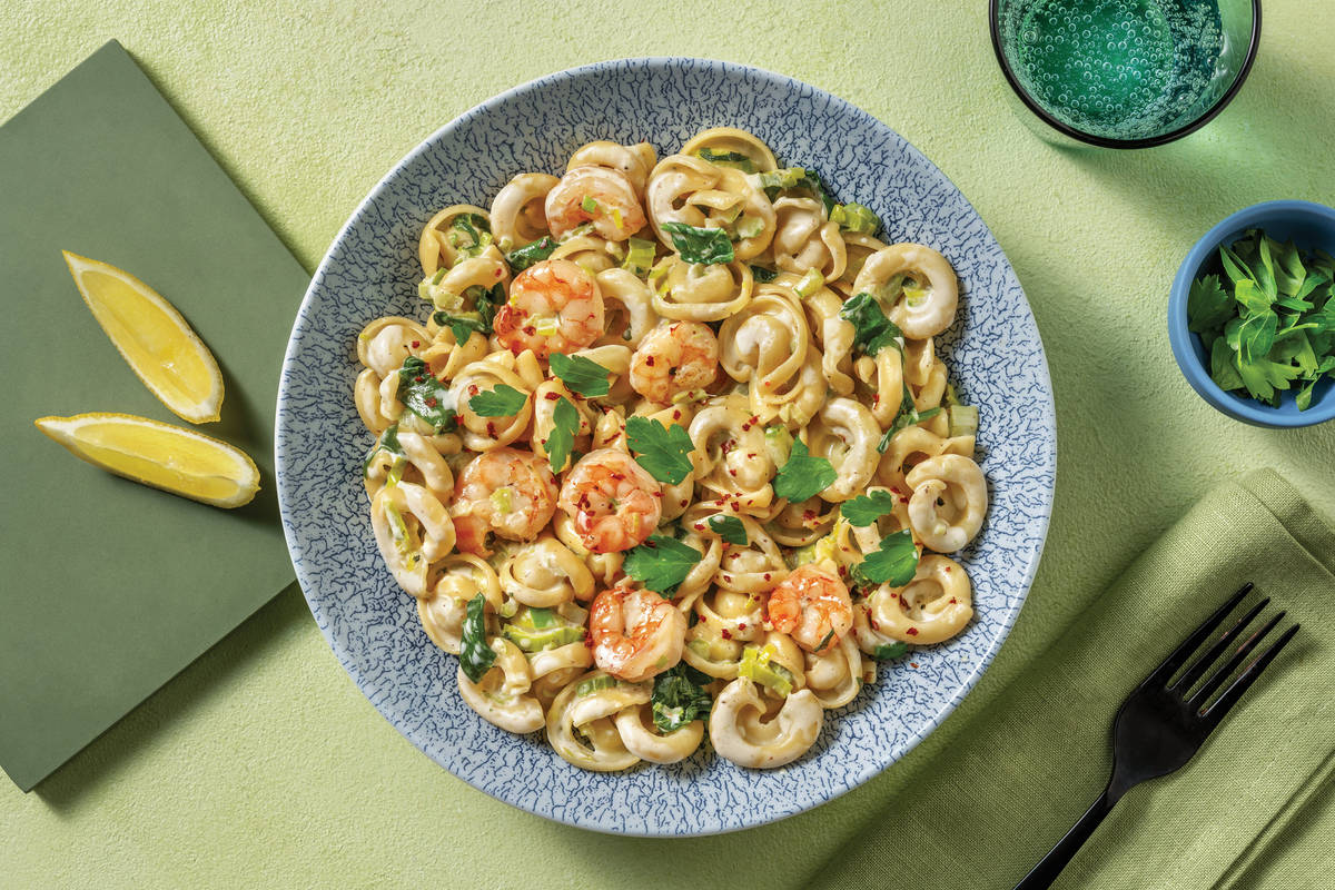 • In a large frying pan, heat a drizzle of olive oil over high heat. Cook prawns, celery and leek, tossing, until prawns are pink and starting to curl up, 3-4 minutes. • Reduce heat to medium, then add garlic & herb seasoning and garlic and cook until fragrant, 1 minute. • Stir in cream (see ingredients), the salt, reserved pasta water and lemon zest until slightly thickened, 1-2 minutes. • Stir through cooked orecchiette, the baby spinach leaves, the butter and a generous squeeze of lemon juice until combined, 1 minute. Season with pepper.