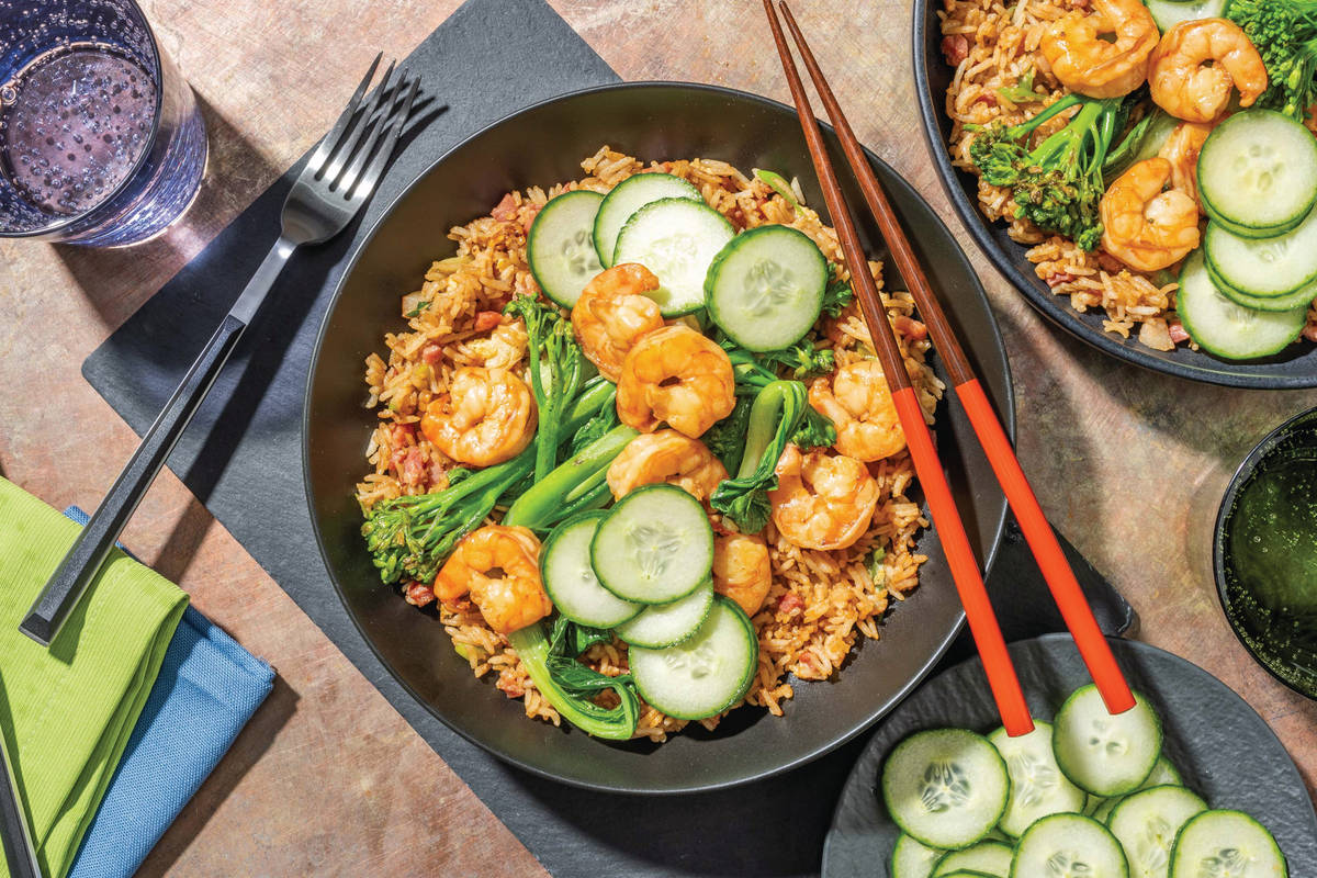 • Drain pickled cucumber. • Bring everything to the table to serve. • Help yourself to some crispy sweet-soy prawns, bacon fried rice, greens and pickled cucumber. Enjoy!