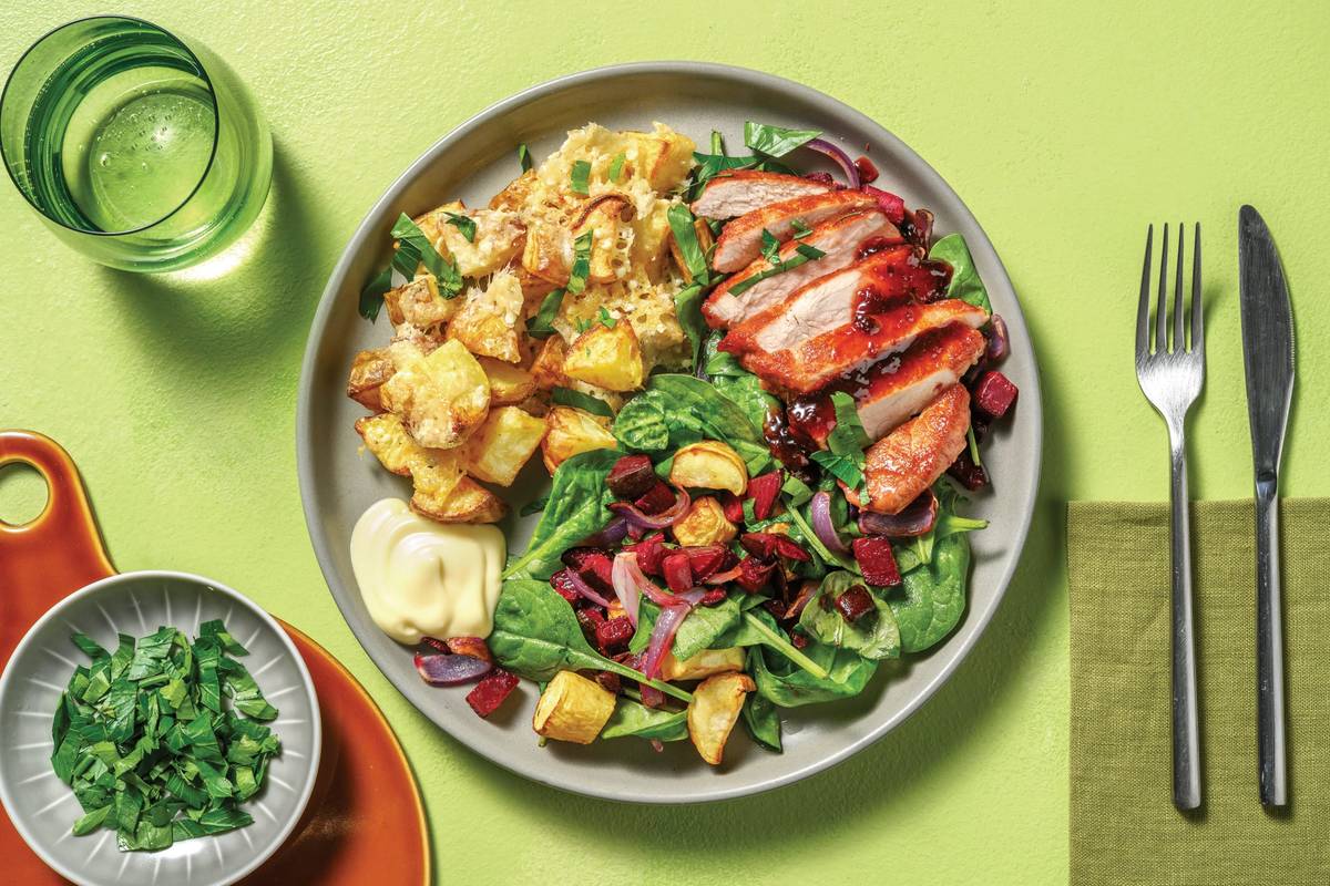 • Slice seared pork. • Divide roast veggie toss between plates. Top with cheesy potatoes and pork. Spoon over any remaining cherry sauce from the pan. • Tear over parsley to serve. Serve with mayonnaise. Enjoy!