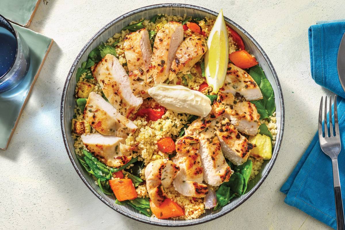 • Slice chicken. • Divide cheesy veggie couscous between bowls. Top with garlic and herb chicken. Pour over any resting juices. • Drizzle over lemon mayo and serve with any remaining lemon wedges. Enjoy!