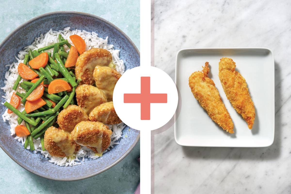 • Divide garlic rice between bowls. • Top with garlic veggies and plant-based crumbed chicken. • Pour Mumbai coconut sauce over plant-based chicken to serve. Enjoy!