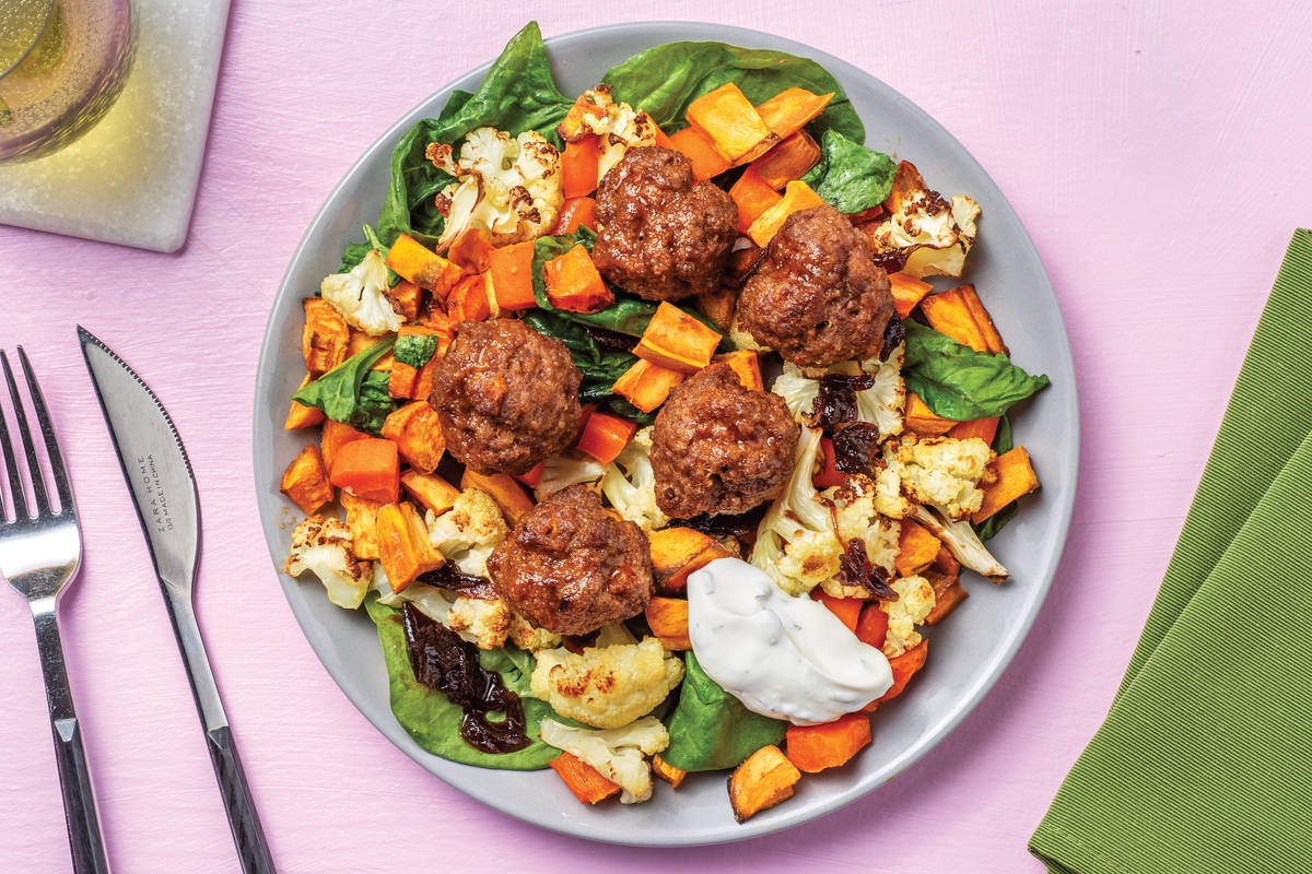 You might expect us to say that the onion chutney is drizzled over the meatballs, but we’re spicing things up. It’s actually tossed through the roasted cauliflower, kumara and other veggies. Our masala paste is rolled up into the beef meatballs and cooled down with a dollop of herby yoghurt. *The recent wet and cold weather across New Zealand has impacted our regular supply of fresh ingredients and as such, what you receive may be slightly different to what’s pictured. Don’t worry, your recipe will be just as delicious!*