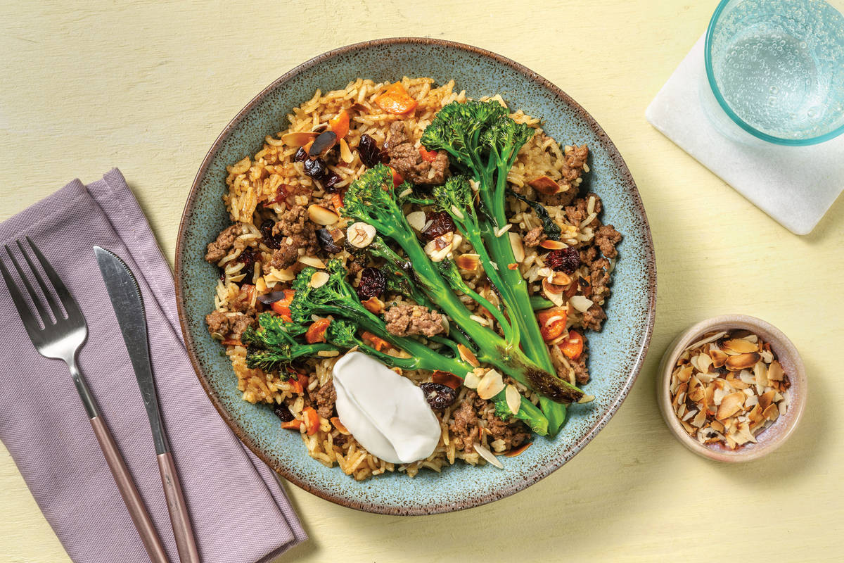 • Add basmati rice, Mumbai spice blend (see ingredients), beef-style stock powder, currants and the boiling water (1 1/2 cups for 2 people / 3 cups for 4 people) to the baking dish with the beef mixture. Stir to combine. • Cover tightly with foil, and bake until rice is cooked and liquid is absorbed, 25-30 minutes. • Meanwhile, return frying pan to medium-high heat with a drizzle of olive oil. Cook baby broccoli until tender, 5-6 minutes. • When the rice and veggies are done, add roasted carrot, baby broccoli and salad leaves to the rice and stir to combine. Season to taste.
