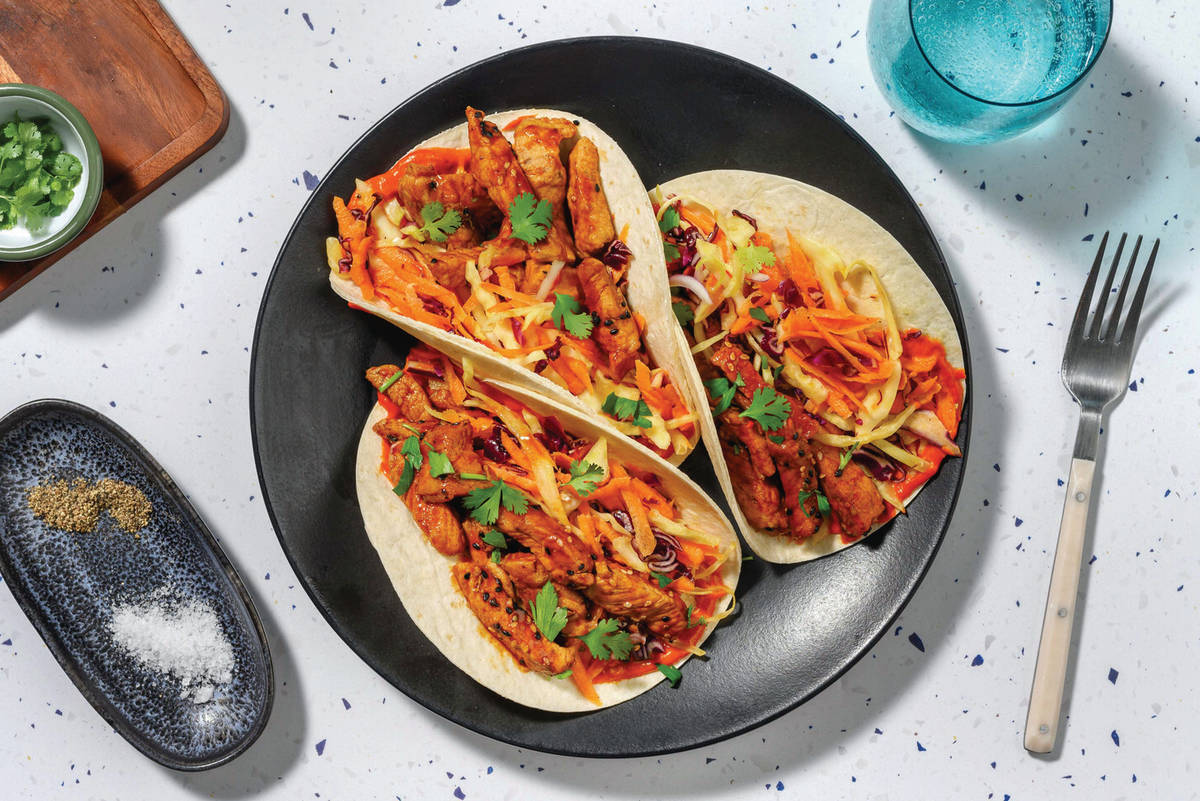 • In a medium bowl, combine shredded cabbage mix, carrot, the sesame oil and a drizzle of vinegar. Season to taste. • Meanwhile, microwave mini flour tortillas on a plate in 10 second bursts, until warmed through.