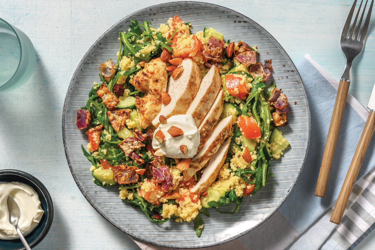 Roughly chop the roasted almonds. Divide the couscous salad between bowls. Top with the yoghurt chicken (plus any juices from the oven tray), onion, almonds and remaining yoghurt.