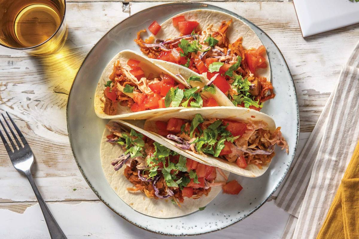Bring everything to the table to serve. Build your tacos by topping the tortillas with the Tex-Mex pulled jackfruit. Top with the charred corn salsa and creamy aioli slaw. Garnish with the coriander.
