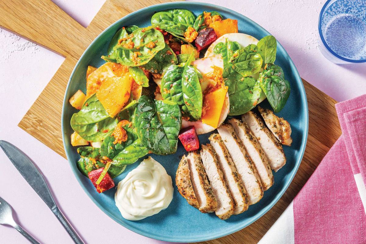 • In a small bowl, combine chargrilled capsicum relish and mayonnaise. • Add baby spinach leaves to the tray with zesty roasted veggie and toss to combine.