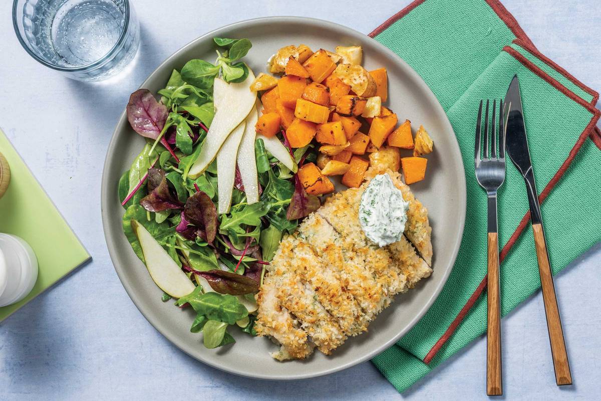 • Slice the chicken. • Divide panko and garlic crumbed chicken and roasted veggies between plates. • Serve with pear salad and the remaining dill-parsley mayonnaise. Enjoy!