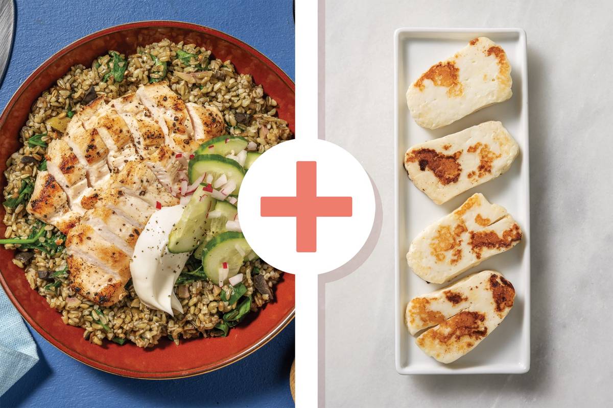 • When the freekeh has 10 minutes remaining, heat a large frying pan over medium-high heat with a drizzle of olive oil. • Cook chicken until cooked through, 3-6 minutes each side (cook in batches if your pan is getting crowded). • Return frying pan to medium-high heat with a drizzle of olive oil. Cook haloumi, until golden brown, 1-2 minutes each side.