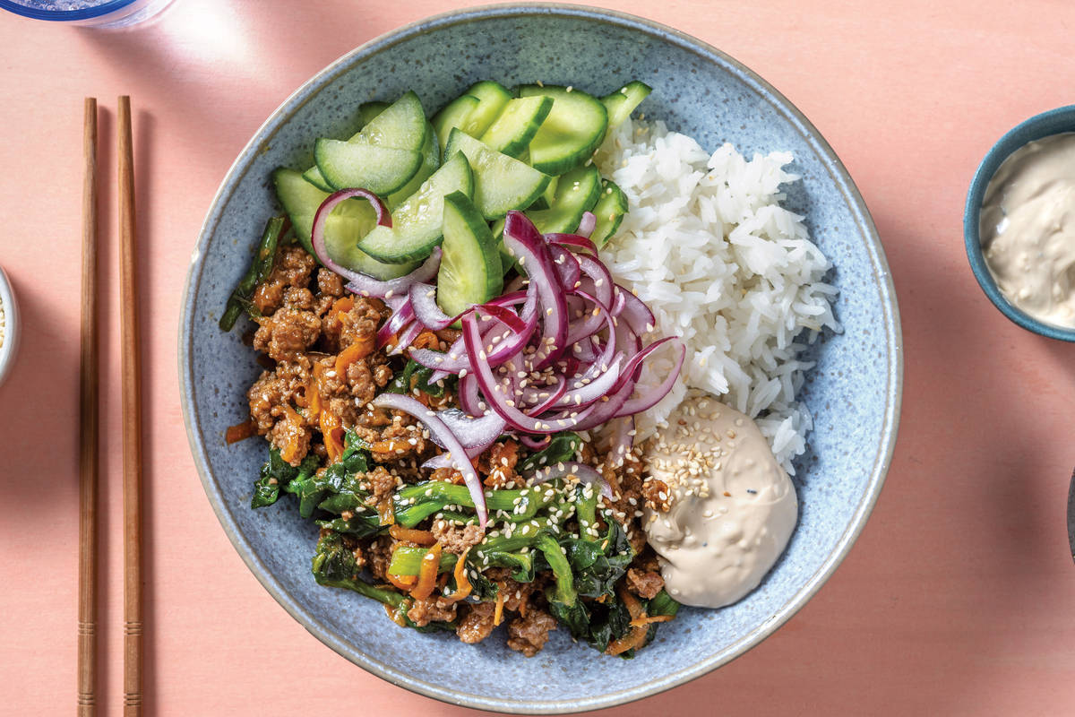 Ginger Beef Rice Bowl with Pickled Onion & Japanese Mayo