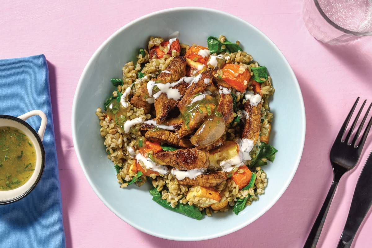 • In a medium bowl, combine beef strips, chermoula spice blend (see ingredients), a drizzle of olive oil and pinch of salt and pepper. • When veggies have 5 minutes remaining, heat a large frying pan over medium-high heat with a drizzle of olive oil. Cook garlic until fragrant, 1 minute. • Transfer garlic oil to a small bowl, then add Greek-style yoghurt and stir to combine. Season to taste. • Return the frying pan to high heat with a drizzle of olive oil. When oil is hot, cook beef strips in batches until browned and cooked through, 1-2 minutes. • Remove pan from heat, add the honey and toss to combine. Transfer to a plate.