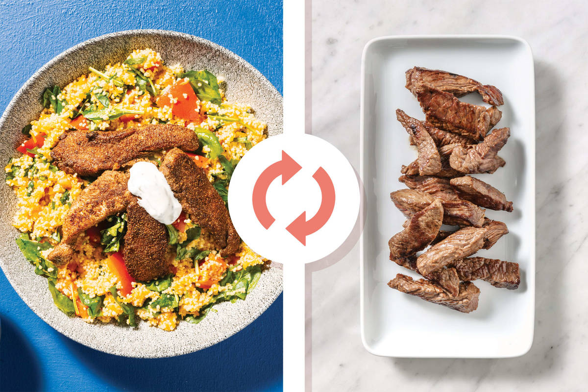 • While the couscous is cooking, discard liquid from beef strips packaging. • In a large bowl, combine Kiwi spice blend and a splash of water.Add beef strips and toss to coat. • In a large frying pan, heat a drizzle of olive oil over high heat. When oil is hot, cook beef strips in batches, until browned and cooked through, 1-2 minutes. Transfer to a plate.