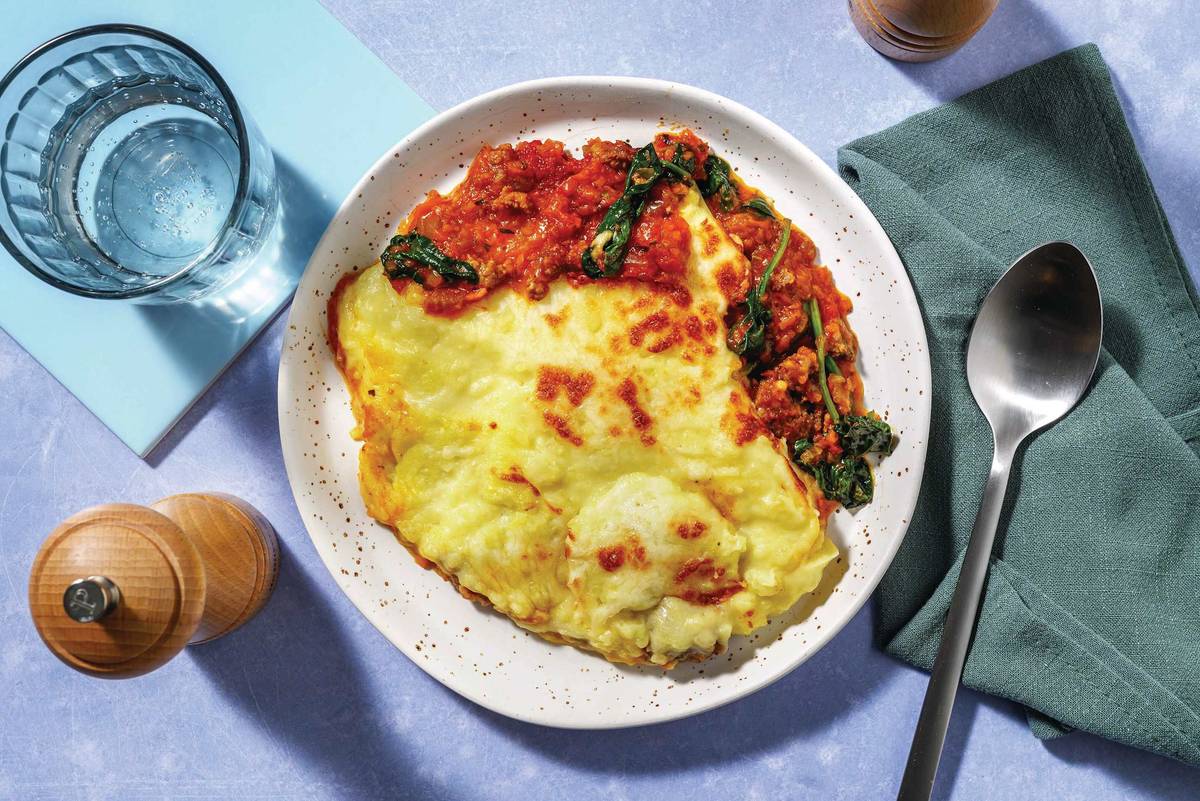 • Preheat oven grill to high. • Transfer mince filling to a baking dish and spread evenly with the mashed potato. • Sprinkle over shredded Cheddar cheese.