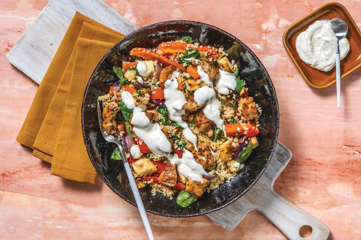 with Roast Veggie Couscous & Lemon Yoghurt
