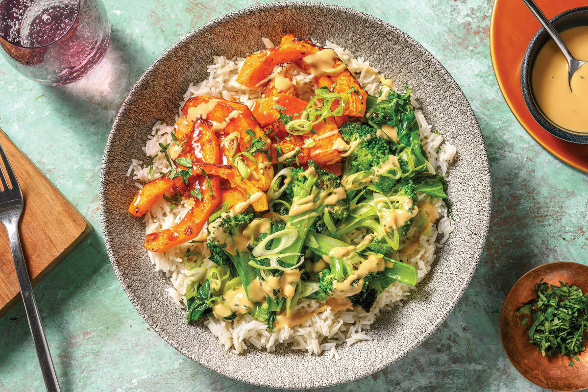 Roughly chop the coriander. Divide the garlic rice between bowls. Top with the honey-soy pumpkin and greens. Pour over excess glaze from the oven tray. Garnish with the coriander and remaining spring onion. Drizzle with the Japanese mayo.
