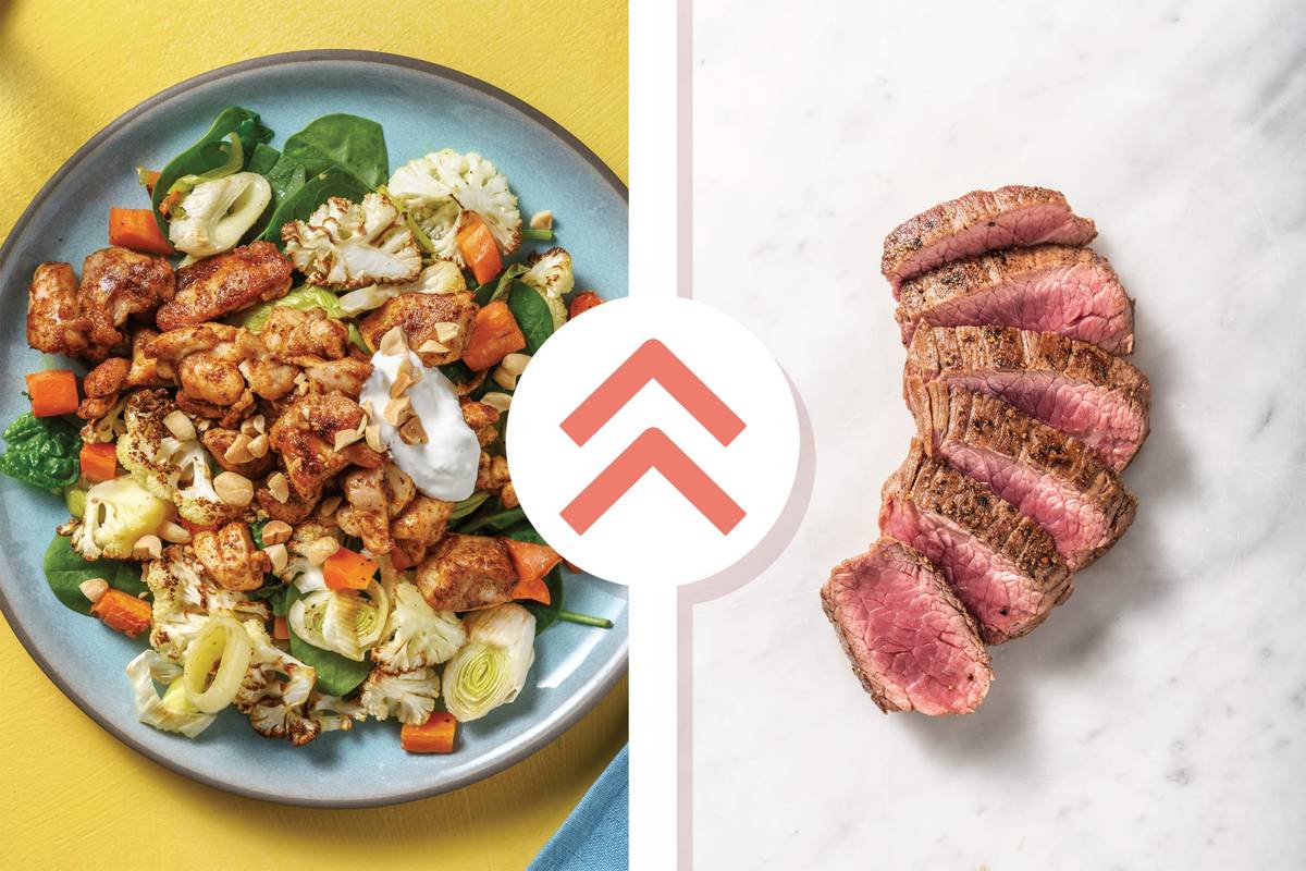 • Divide roast veggie medley between plates. Top with Mumbai glazed chicken steaks. • Spoon over any remaining juices from the pan. • Top with Greek-style yoghurt to serve. Enjoy!