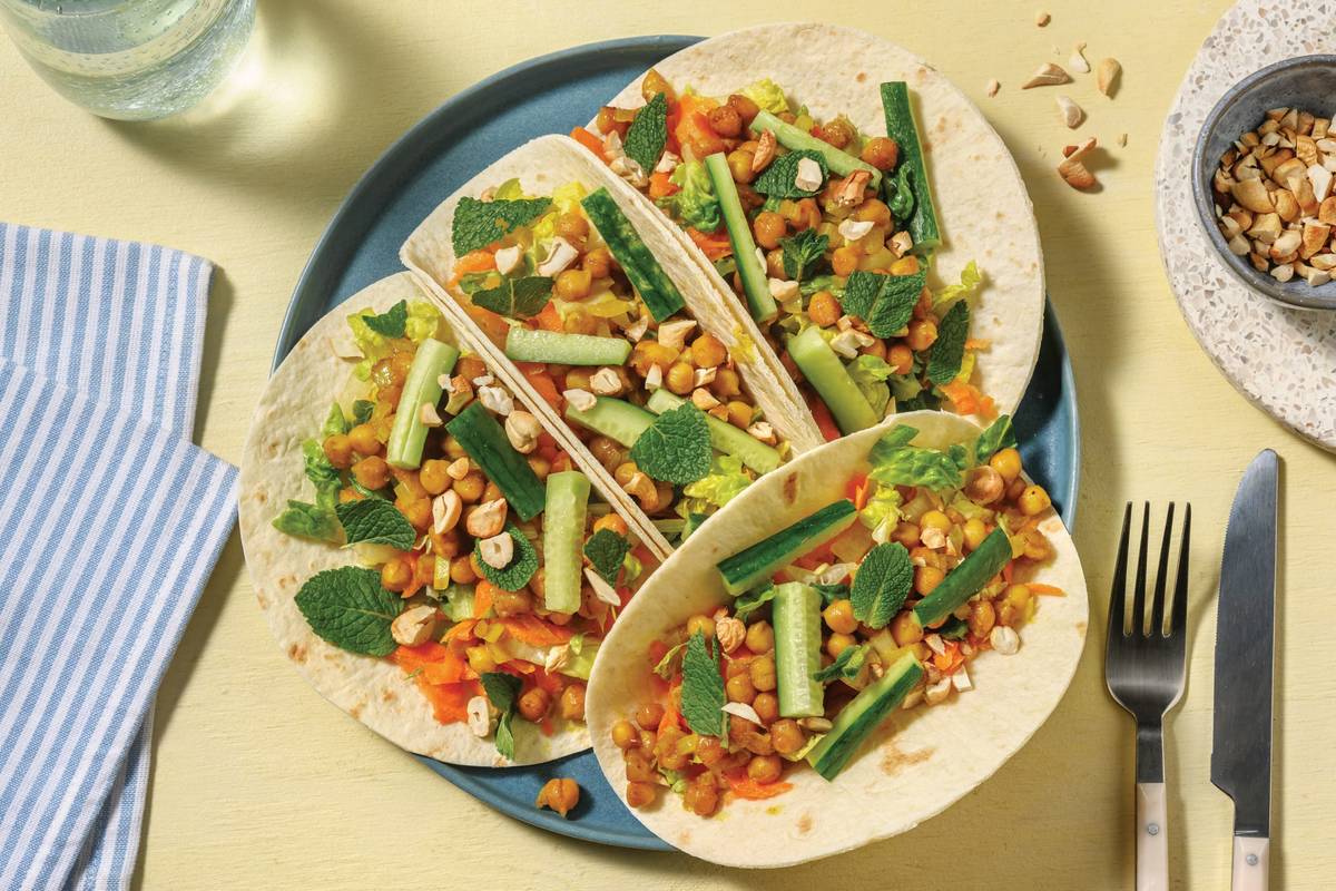 • Bring everything to the table. • Build your tacos by topping tortillas with salad, apricot-glazed chickpeas and cucumber. • Tear over parsley, garnish with crushed roasted cashews and drizzle over garlic aioli to serve. Enjoy!