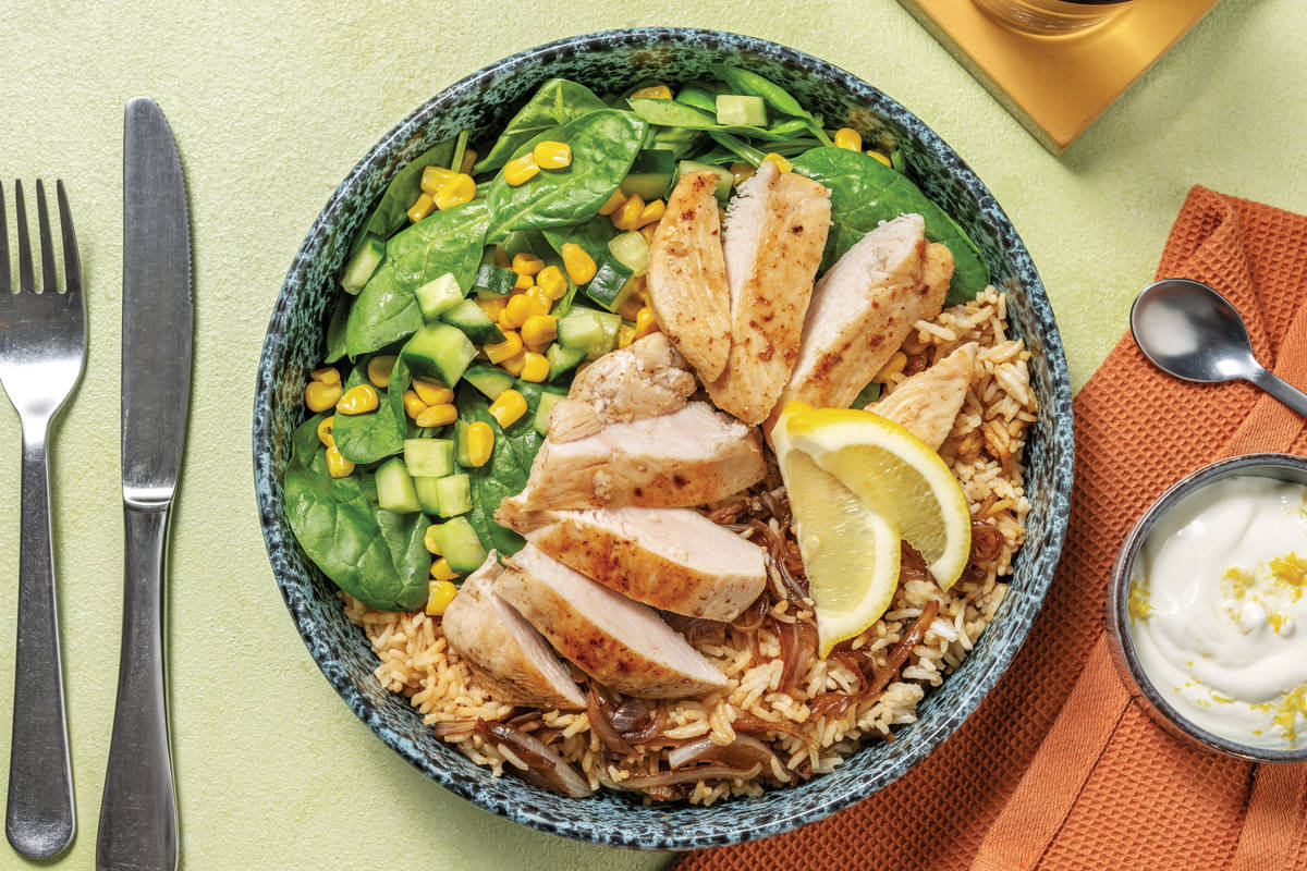 • While the chicken is cooking, add baby spinach, cucumber, a squeeze of lemon juice and a drizzle of olive oil to the bowl with charred corn. Toss to combine and season to taste. • When the brown rice is done, stir through caramelised onion and season generously with salt and pepper.