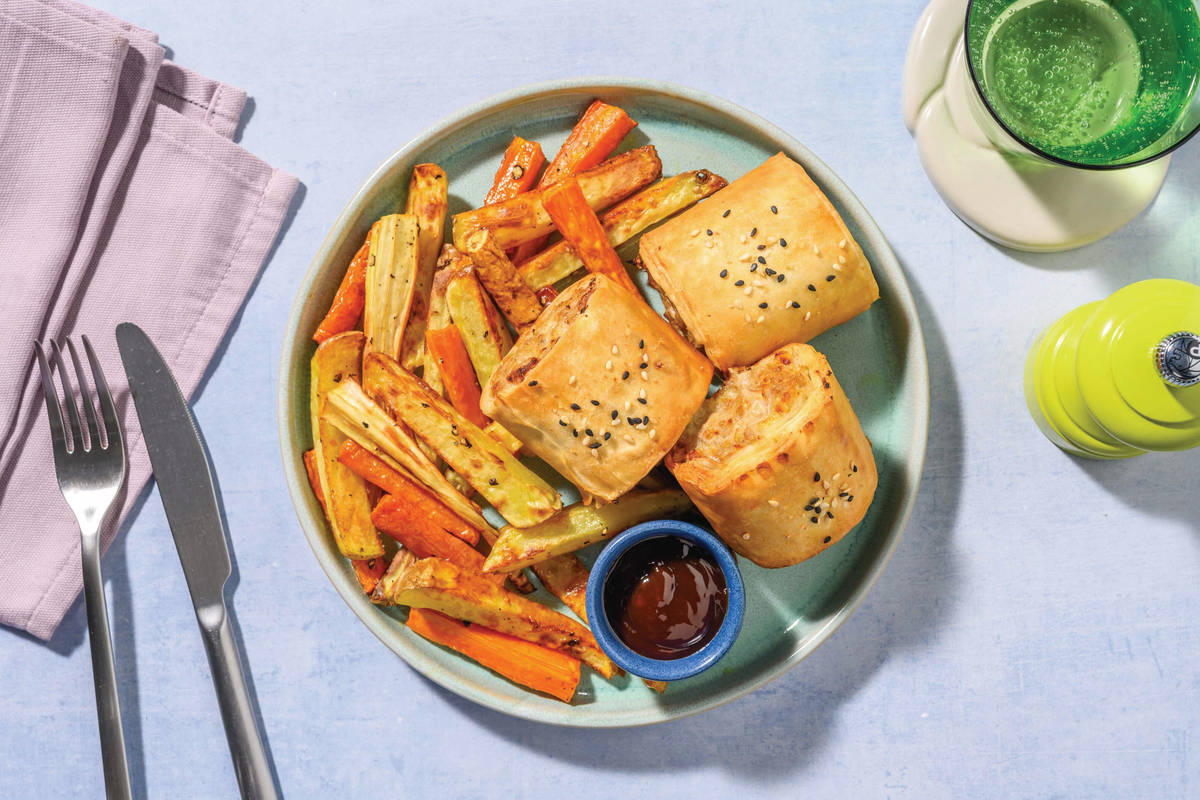 • Divide lamb and apple sausage rolls and rainbow fries between plates. • Serve with BBQ sauce. Enjoy!