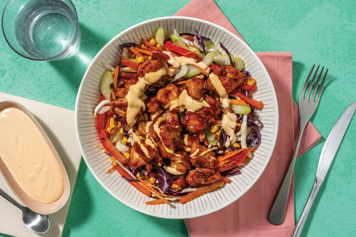 • Divide charred capsicum-corn slaw between bowls. • Top with Korean-style sticky chicken. • Drizzle with sriracha mayo to serve. Enjoy!