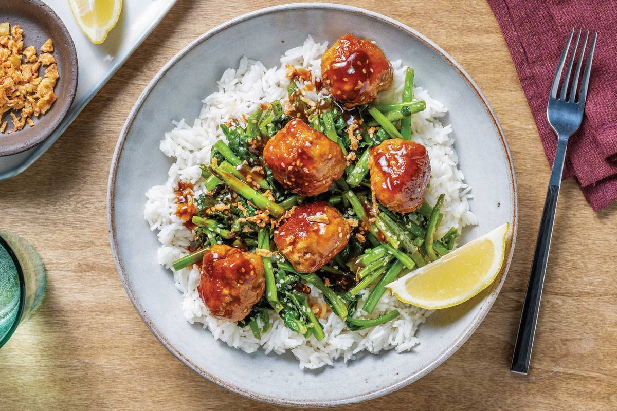 Divide the garlic rice and sesame veggies between bowls. Top with the Korean-glazed pork meatballs and spoon over any remaining sauce from the pan. Serve with any remaining lemon wedges. Garnish with the crispy shallots. Enjoy!