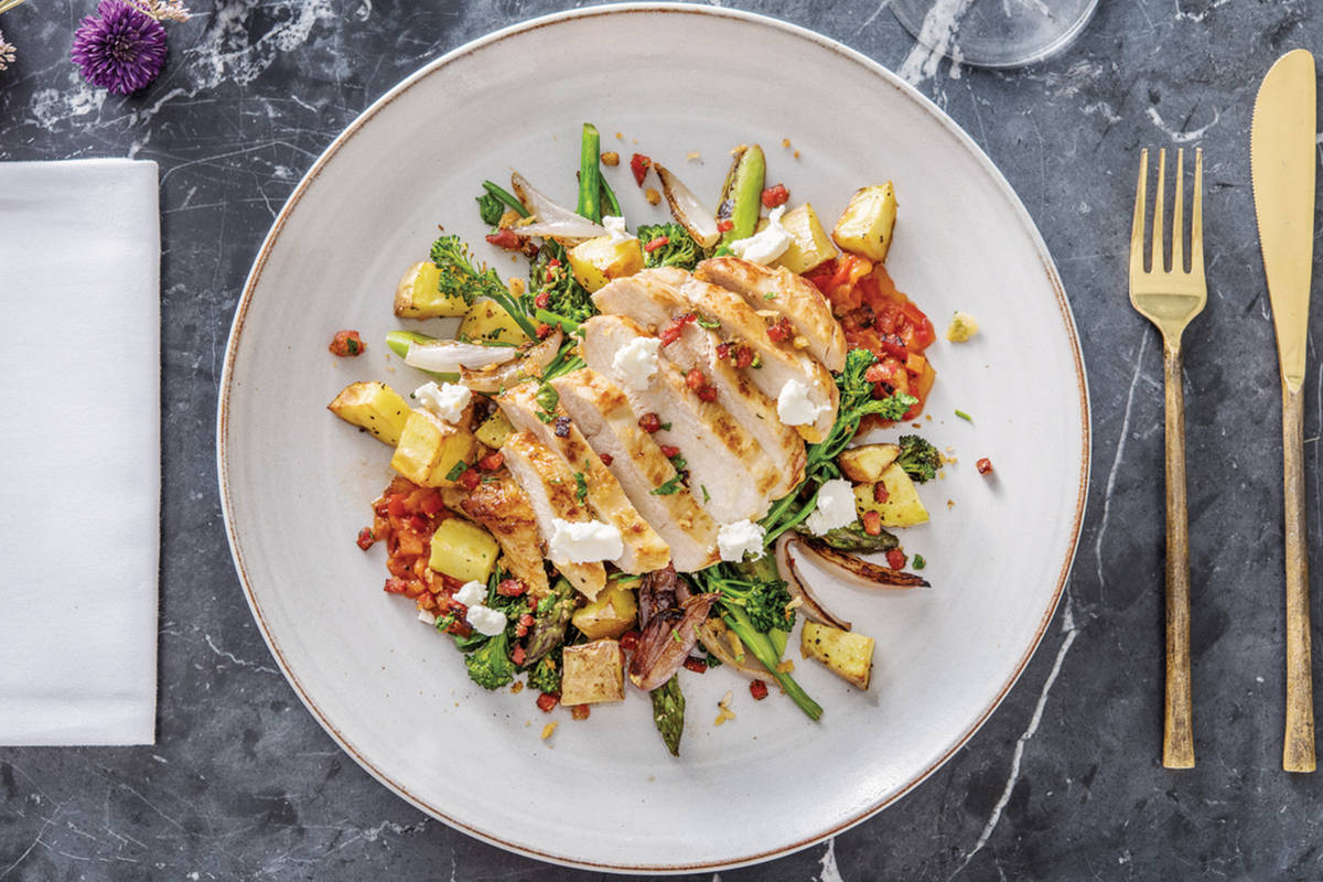 Here's how to turn a chicken breast into a meal fit for a king. Shower lemon and garlic roasted chicken with a crunchy crumb topping peppered with tempting chorizo. Inspired by simple yet stunning Spanish cooking, this elegant dish gets even better with tender asparagus and golden potato on the side. Top it off with a scattering of goat cheese and a chargrilled capsicum relish and you have a meal deserving of the fanciest occasion.