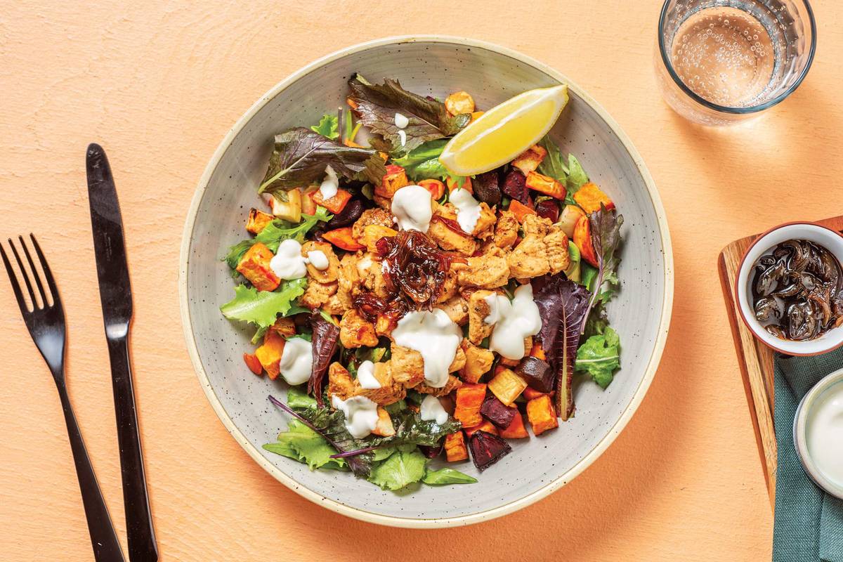 • Divide roast root veggie salad between bowls. Top with lemon pepper halloumi and caramelised onion. • Drizzle with honey yoghurt dressing and serve with any remaining lemon wedges. Enjoy!