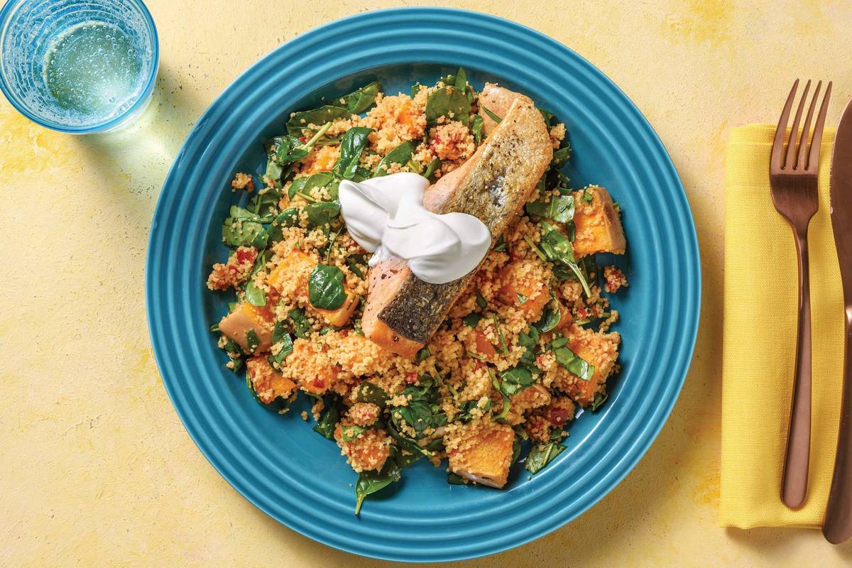 • In a bowl, combine spinach, capsicum relish, pumpkin and couscous • Drizzle with oil. Season and toss • Serve veggie couscous and salmon • Top with yoghurt. Enjoy!