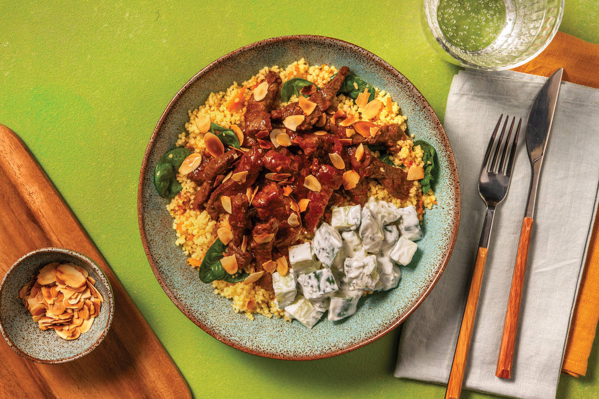 • Slice beef rump. • Divide couscous between bowls. Top with apricot-glazed Mumbai beef. • Sprinkle with toasted almonds and serve with cucumber raita. Enjoy!