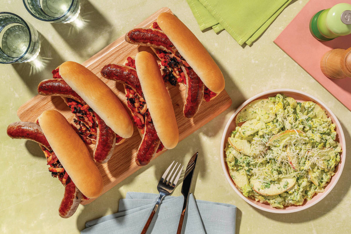 • Bring everything to the table to serve. • Fill hot dog dog buns with chargrilled capsicum relish, pork sausages and grilled bacon onions. • Serve with avocado cos salad. Sprinkle grated Parmesan cheese over salad. Enjoy!